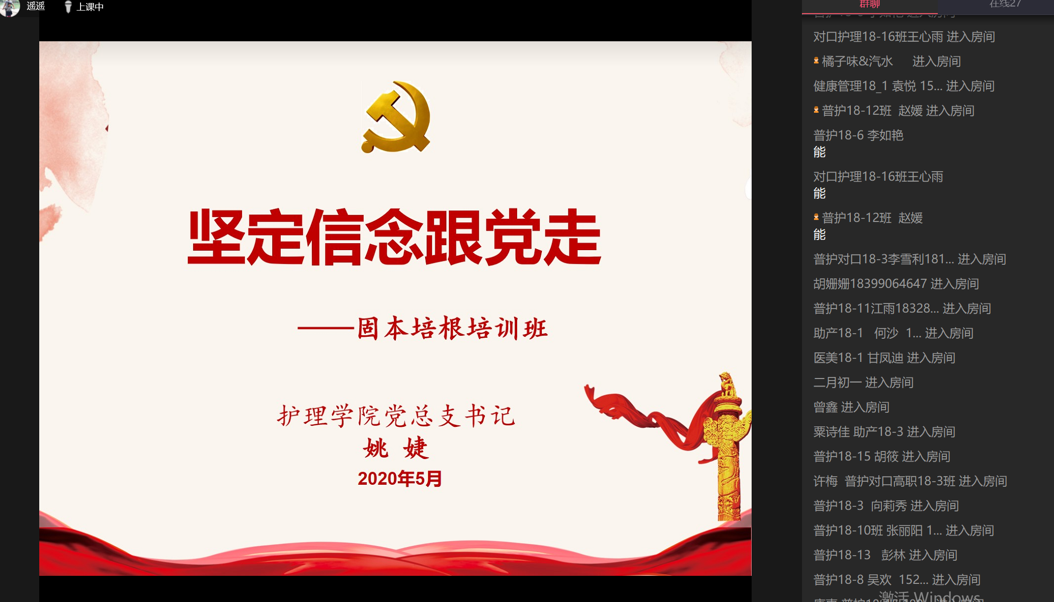 5月26日,护理公司党总支2020年首期固本培根培训班“坚定信念跟党走”通过QQ群课堂顺利开展。本次培训由护理公司党总支书记姚婕主讲,入党积极分子、员工干部代表100余人参加培训。