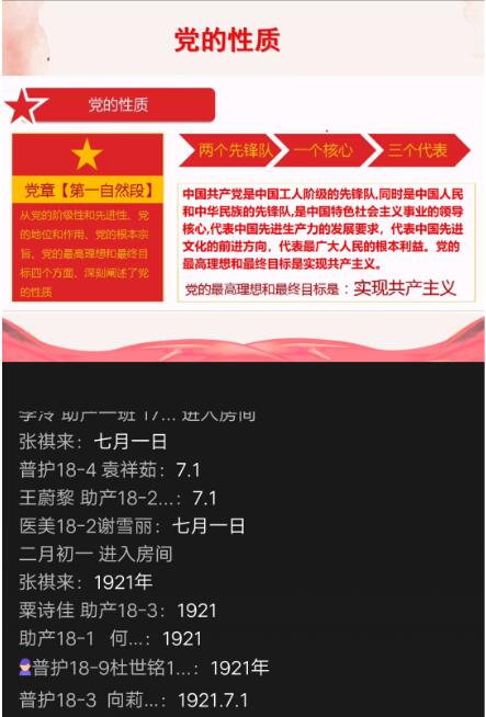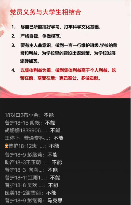 姚婕首先结合新冠肺炎疫情防控及国内外局势讲解了我国制度优势。接下来从党的历史、基本知识以及习近平的新时代中国特色社会主义思想等和同学们进行了深入浅出的交流,要求同学们要做到三点:一是坚定理想信念,牢记初心和使命,树立正确的世界观、人生观、价值观;二是严格遵守道德规范,在工作和生活中重品行、做表率;三是要树立护理学子的职业理想,在学习专业技能的同时培养职业荣誉感和使命感。