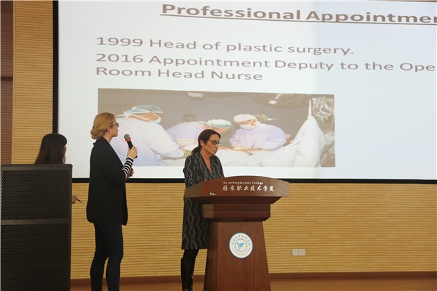 英巴·威兹曼是四川省外国专家局和雅安市外国专家局洽谈引进雅安的2017年引智项目专家,她在讲座中介绍了以色列护理教育,也介绍了她的家庭以及作为一名军人的过往,她的培训经历以及如何成为一名优秀的手术室护士,讲座期间还鼓励了师生们要努力奋斗,积极进取,并开展了师生互动。讲座后,在王静主任的带领下参观了护理系的实训室。
