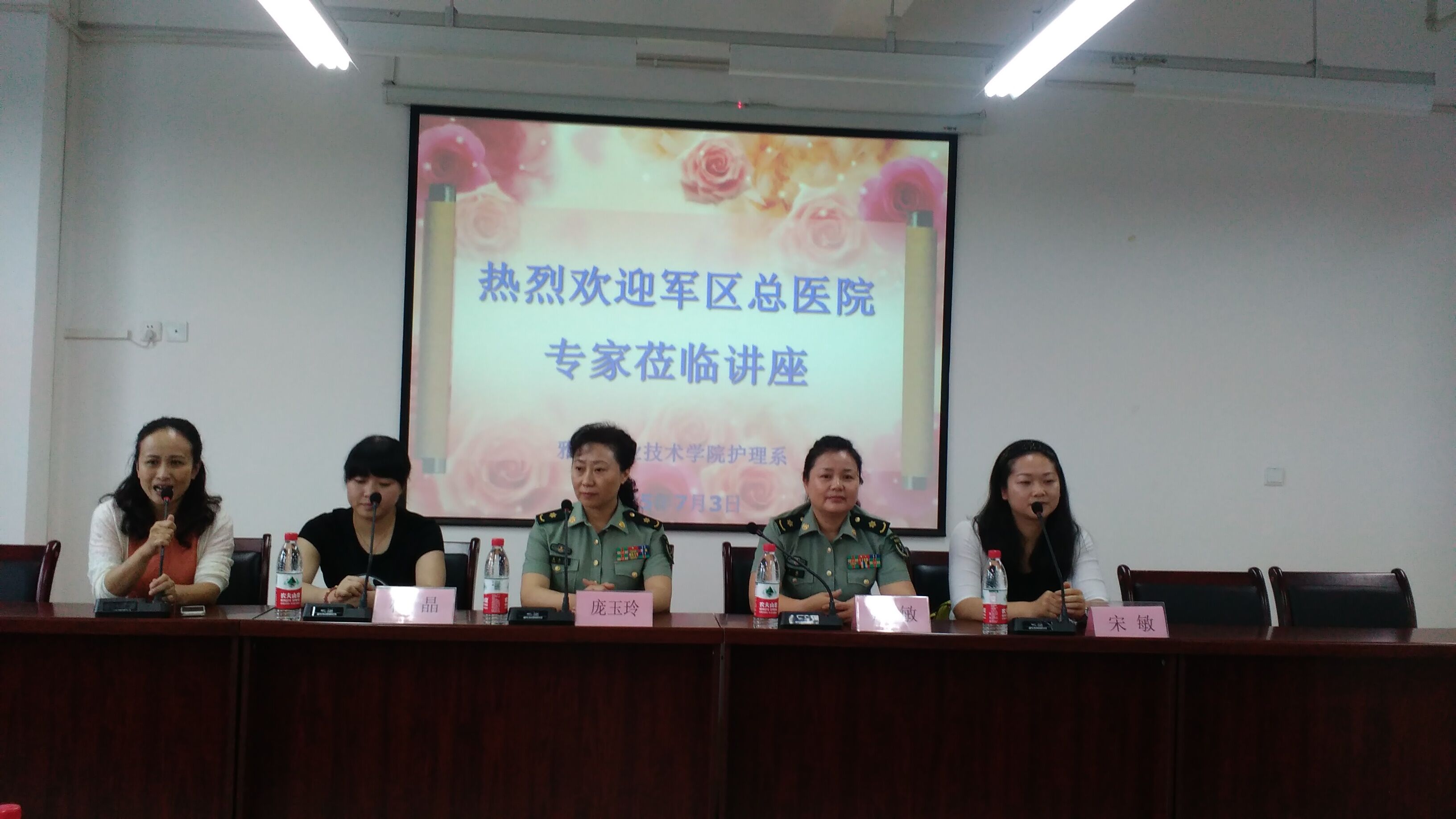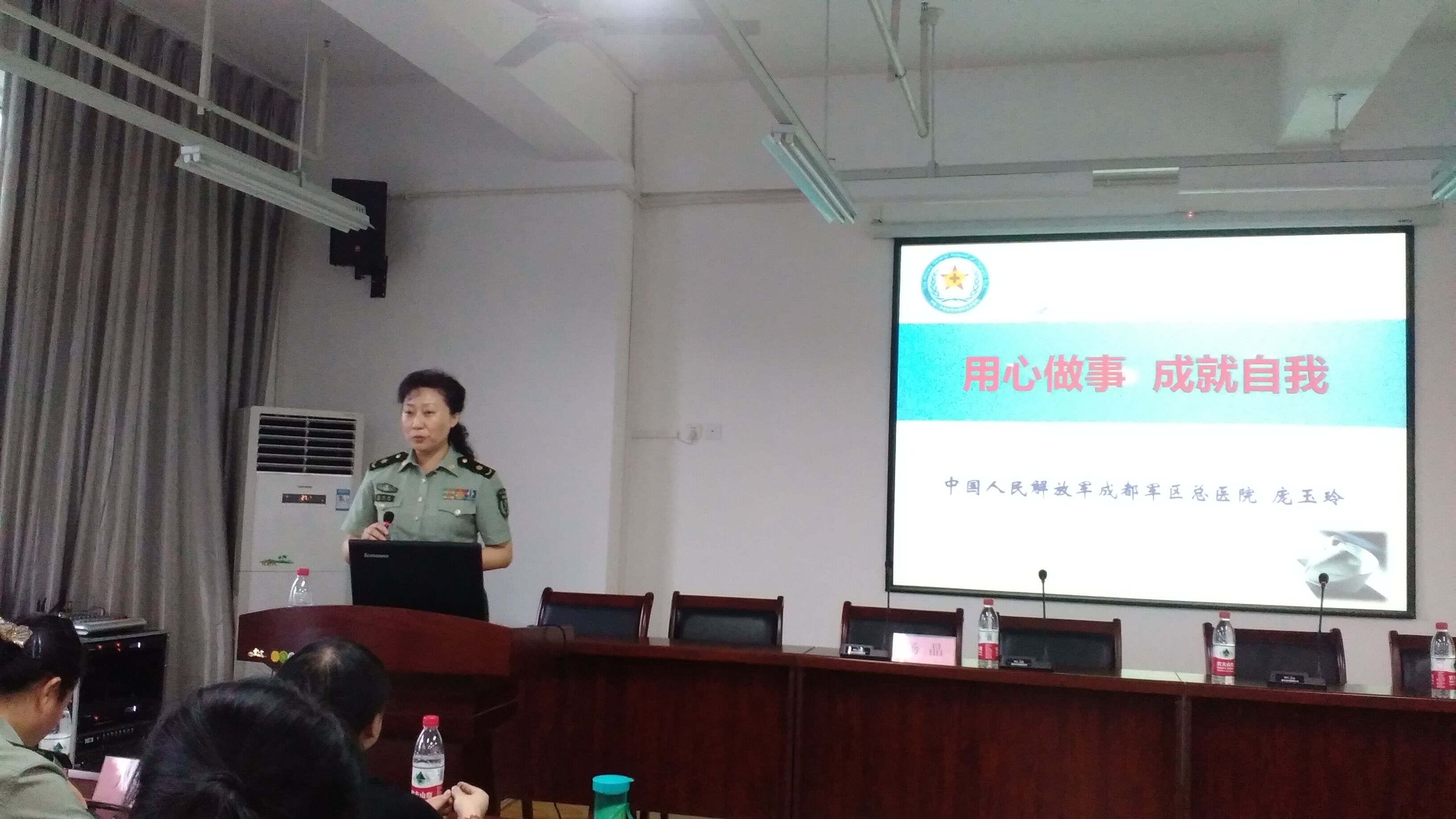 2015年7月3日,成都军区总医院卢敏总护士长一行4人莅临公司,为我系90余名实习生及实习管理老师举办了精彩讲座。卢敏总护士长带来了《护生的角色转变》,庞玉玲总护士长讲座题目为《用心做事,成就自我》,宋敏和杨晶老师分别带来了《成总为我引路》以及《针尖上的护理》。