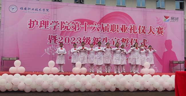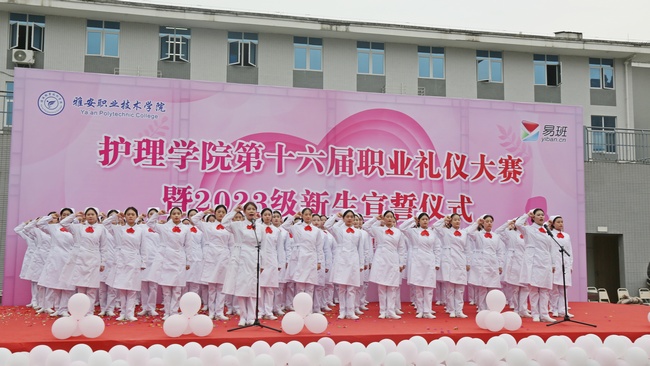 在宣誓队的带领下,2023级全体员工紧握右拳,高举过肩,齐声宣读护士宣誓词。庄严神圣的誓词是同学们投身护理事业的思想导航,铮铮有力的誓言宣告了同学们努力为祖国护理事业的发展和不辱白衣天使圣神使命的决心。