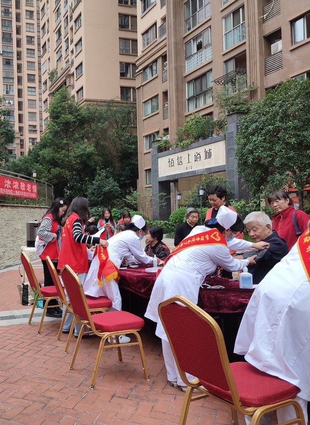 身着红色志愿服和白色护士服的志愿者们有序开展了义诊活动 。一部分志愿者为社区居民宣讲“合理膳食,健康生活”及高血压预防相关知识,一部分志愿者为社区老人测量血压。张雪庆老师为老年人宣讲急救知识,强化老年人卫生健康意识;黄丹老师指导志愿者为老年人进行健康护理。志愿者热情的服务得到了居民们的一致好评。