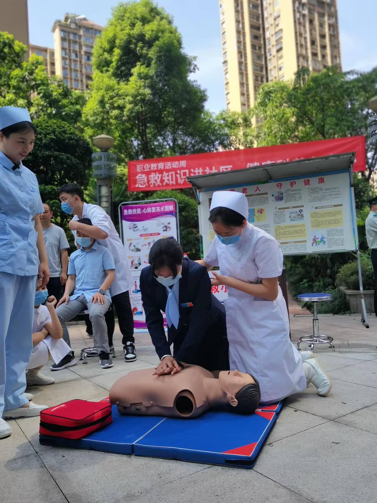 身着红色志愿服和白色护士服的志愿者们有序开展义诊和科普活动。一部分志愿者教授居民们心肺复苏操作方法,另一部分同学娴熟地为居民测量血糖血压,同时进行老年人健康知识宣讲。居民们积极响应,并给予志愿者一致好评。