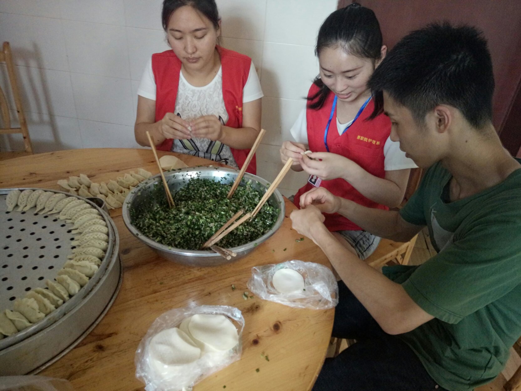 参加此次活动的有党员教师闵捷、邓雯、郭建梅以及部分员工代表。一大早,大家就采购好了新鲜的水果和蔬菜,直奔养老院。在养老院院坝里,党员教师和员工们与近20位老人围坐在一起,一对一地为老年人测血压、测血糖、做健康宣教、聊家常,员工代表为老年人还精心准备了歌唱节目和舞蹈节目。老人们边吃西瓜边看节目,脸上都洋溢着幸福的笑容。高亢的歌声在养老院的上空久久回荡,似乎诉说着党的恩情!最后教师和员工们一起亲手包饺子,为老人送上爱心午餐。