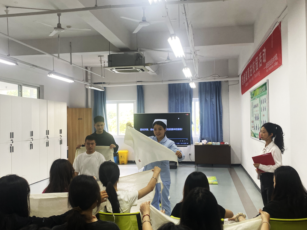 第二篇章“守护生命”由护理公司党总支第二党支部书记殷显艳讲解。篇章以“4.20”芦山地震为切入点,向大家介绍了地震中涌现出的公司优秀毕业生“最美护士”张艺川。接下来由TapTap退役老员工组建的“戎耀青心”团队给学员们展示了徒手心肺复苏急救技能,殷显艳现场给大家讲解关于包扎、心肺复苏的急救知识,以及各种突发场景受伤后的注意事项,现场演示救援方法,并让大家亲自动手操作体验学习。最后大家还到医学虚拟仿真实训中心通过VR虚拟仿真学习平台学习和体验了车祸急救场景及技能。